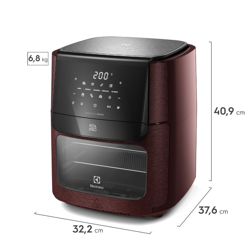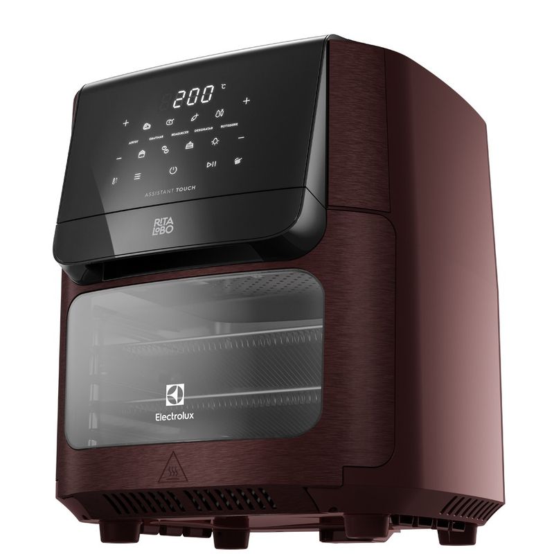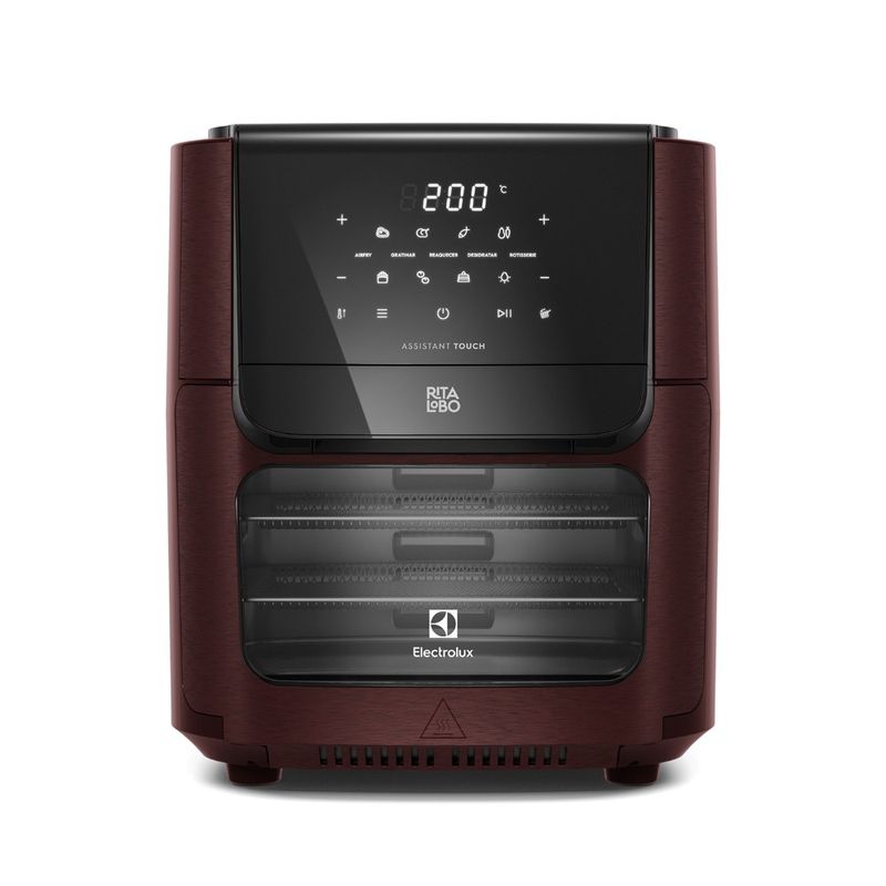 Agora também disponível na cor vermelho. a AirFryer Oven Electrolux Experience por Rita Lobo de 12L dá mais sabor. beleza e rapidez para os seus pratos. isso porque é 5 em 1 A AirFryer Oven Electrolux Experience. assinada por Rita Lobo. tem 12L de capacidade e é de uso multifuncional para quem quer preparar comida de verdade. mantendo uma alimentação saudável e saborosa. Além da maior capacidade. esse modelo da linha Electrolux por Rita Lobo é 5 em 1. A fritadeira elétrica conta com 5 modos de preparo em 1 único produto: Airfry. Gratinar. Reaquecer. Desidratar e Rotisserie. Agora dá para fazer em casa o clássico frango assado de padaria. A função Rotisserie aciona o espeto giratório. que assa por igual frangos. legumes. carnes e outros. enquanto rotaciona o alimento. Na função Desidratar. você consegue preparar deliciosos chips de frutas e legumes. É tão intuitivo. O processo conta com temperatura e tempo ajustáveis. de 2h a 24h. Para finalizar seus pratos com uma camada crocante. é só usar a função Gratinar. Ela é ideal para batatas recheadas. por exemplo. A função Reaquecer é perfeita para aquecer os alimentos que saíram direto da geladeira e para reaquecer pães e pizzas. Sempre mantendo aquela crocância. Aproveite a Função Airfry para assar ou fritar os pratos de sua preferência ou preparar uma das 7 receitas pré-selecionadas. Faça carne. frango. peixe. legumes. batata. pão de queijo e bolo com apenas um toque. O Painel Digital tem mais de 10 funções programadas. Além dos 5 modos de preparo e das 7 receitas pré-selecionadas. traz ainda as funções Preaquecer e Virar. A função Preaquecer indica quando a fritadeira elétrica atinge a temperatura ideal e está pronta para uso. Já a função Virar emite um aviso sonoro e luminoso que indica o momento certo de virar ou mexer o alimento para assar ou fritar por igual. No Botão Seletor de Temperatura. dá para definir a temperatura entre 60°C e 200°C. chegando ao ponto ideal de diversas receitas. Além de fazer comida prática. prepara alimentos feitos em casa com até 90%¹ a menos de gordura e quase 50%¹ a menos de calorias quando comparado à fritura tradicional à óleo. A AirFryer Oven Electrolux por Rita Lobo também inclui Kit de Acessórios: duas grelhas. espeto giratório e gancho. bandeja coletora de resíduos e cesto interno de 3.5L.