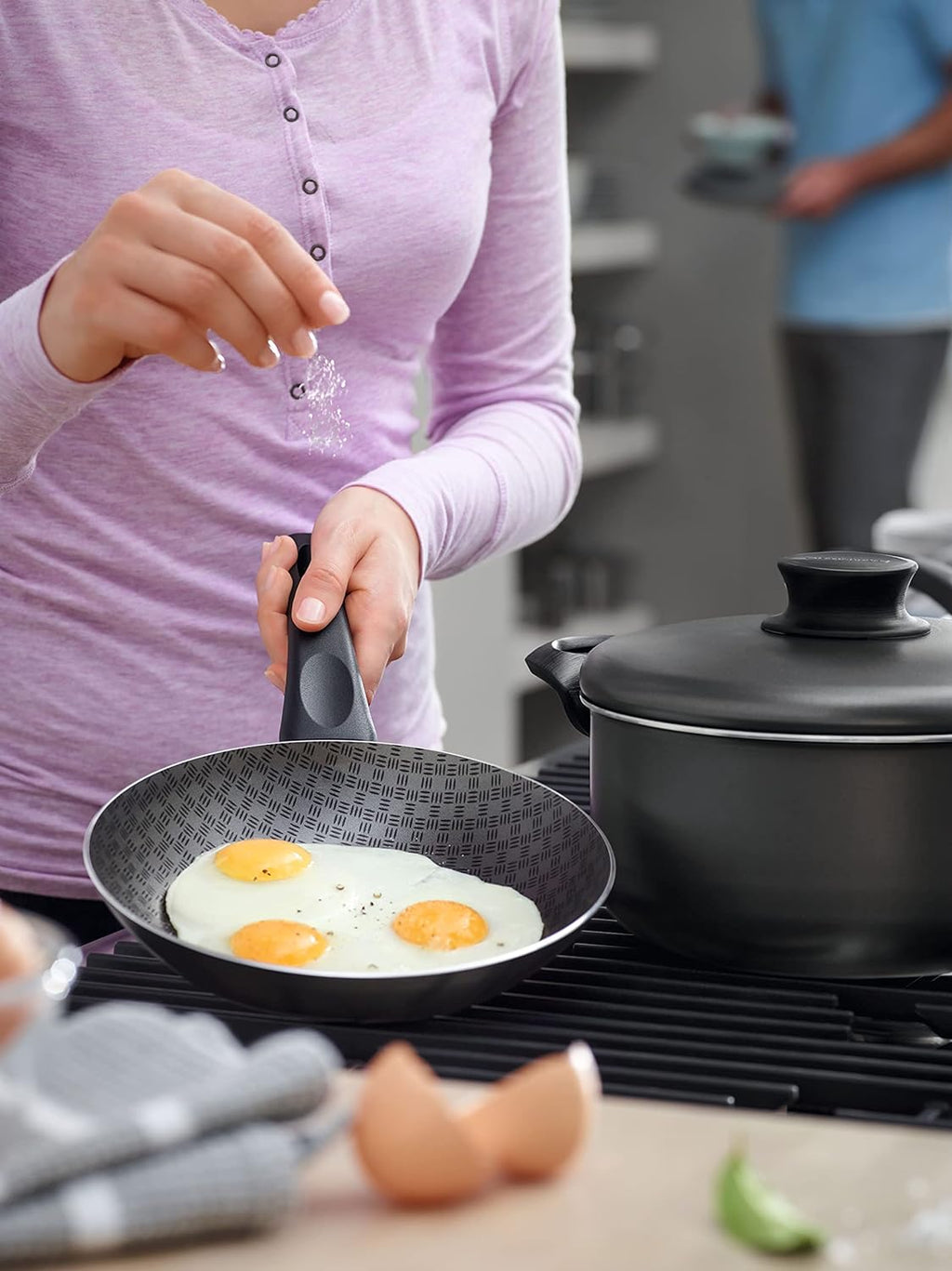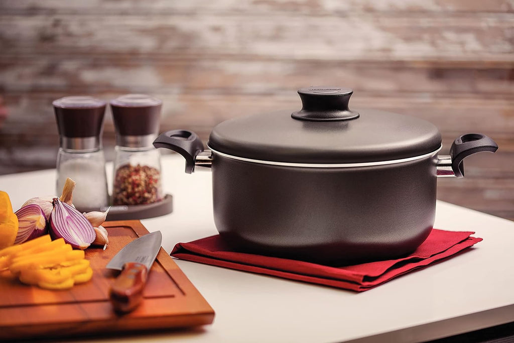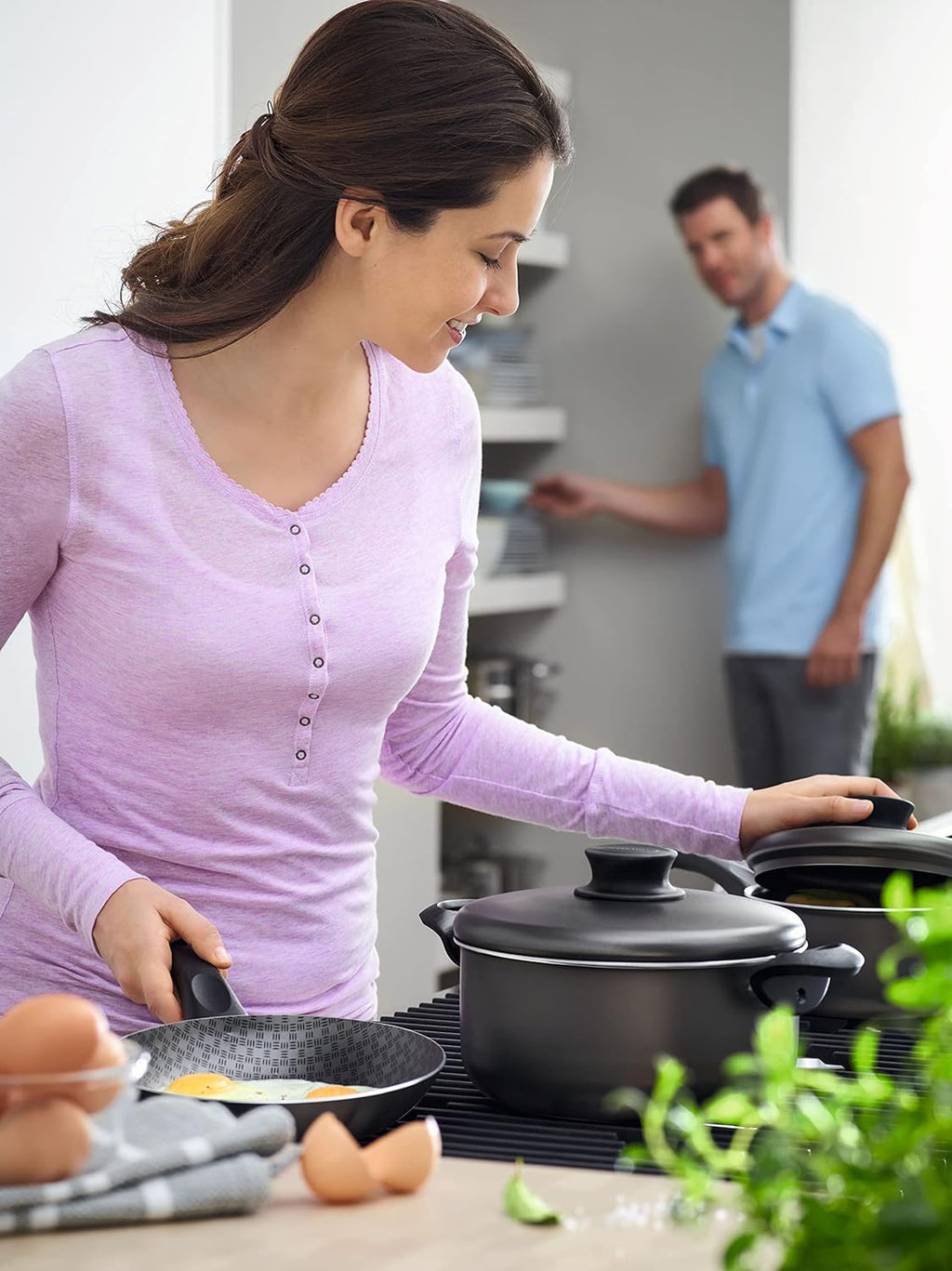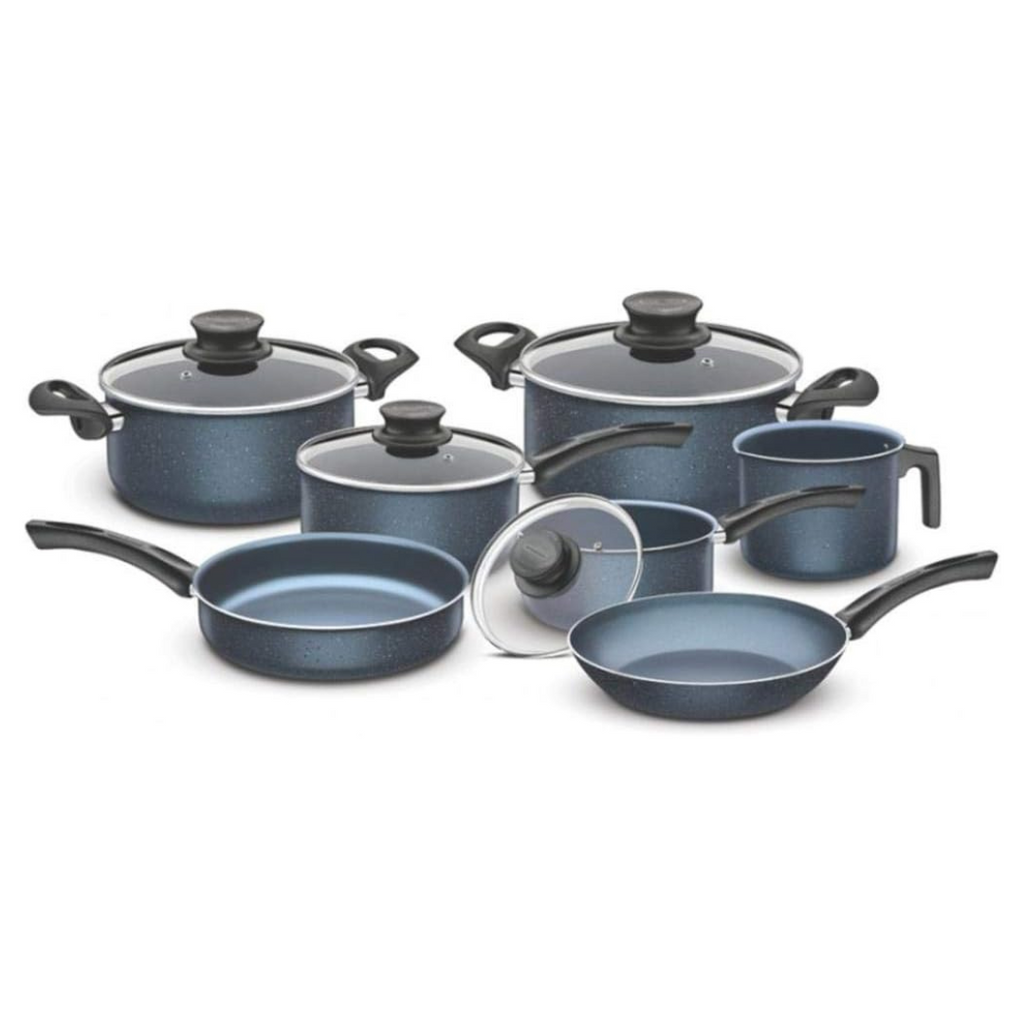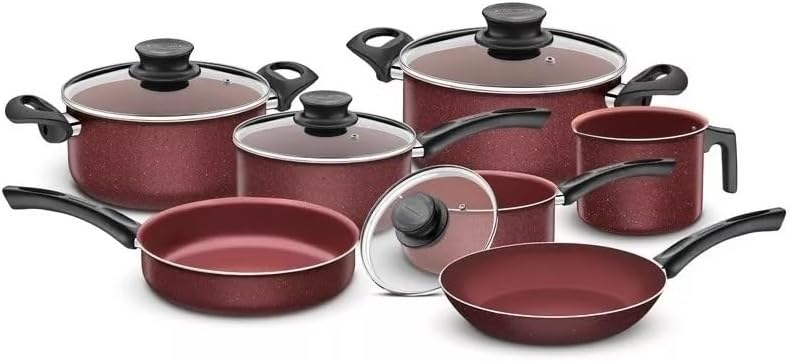 Alumínio com revestimento interno e externo de antiaderente Starflon T1. Cabos, alças de baquelite antitérmico e pegadores de nylon. Tampas de alumínio com saída de vapor.