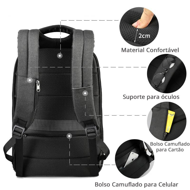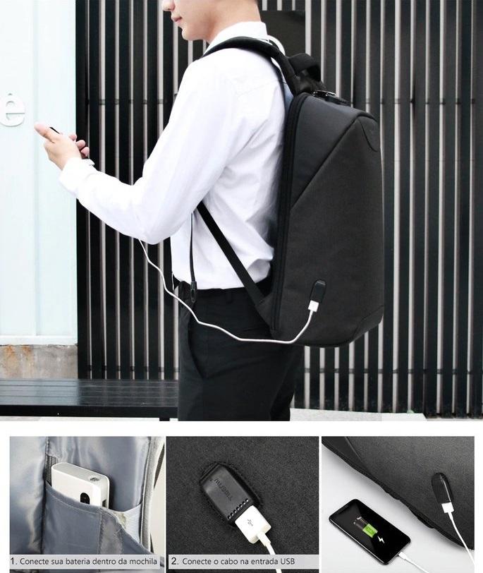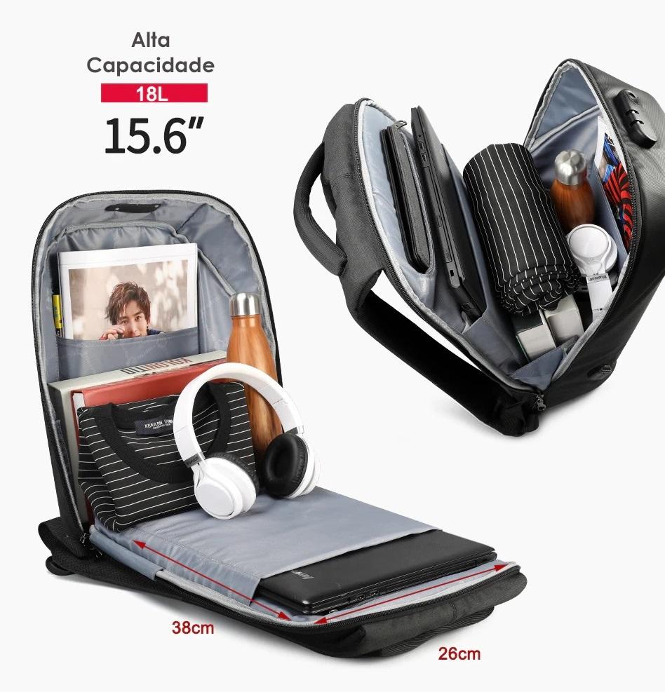 Mochila para Notebooks de até 15.6'' com entrada USB para carregamento de dispositivos, utilizando carregadores portáteis (não incluídos), material resistente à água e com design super moderno.