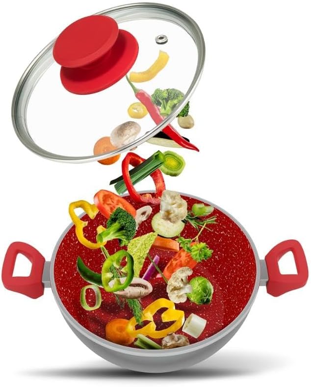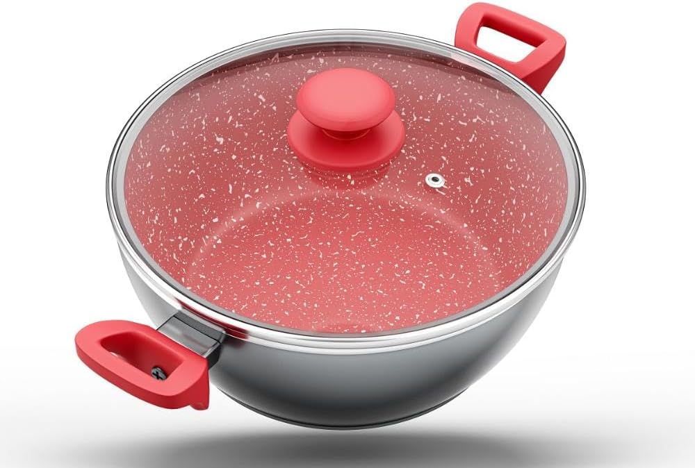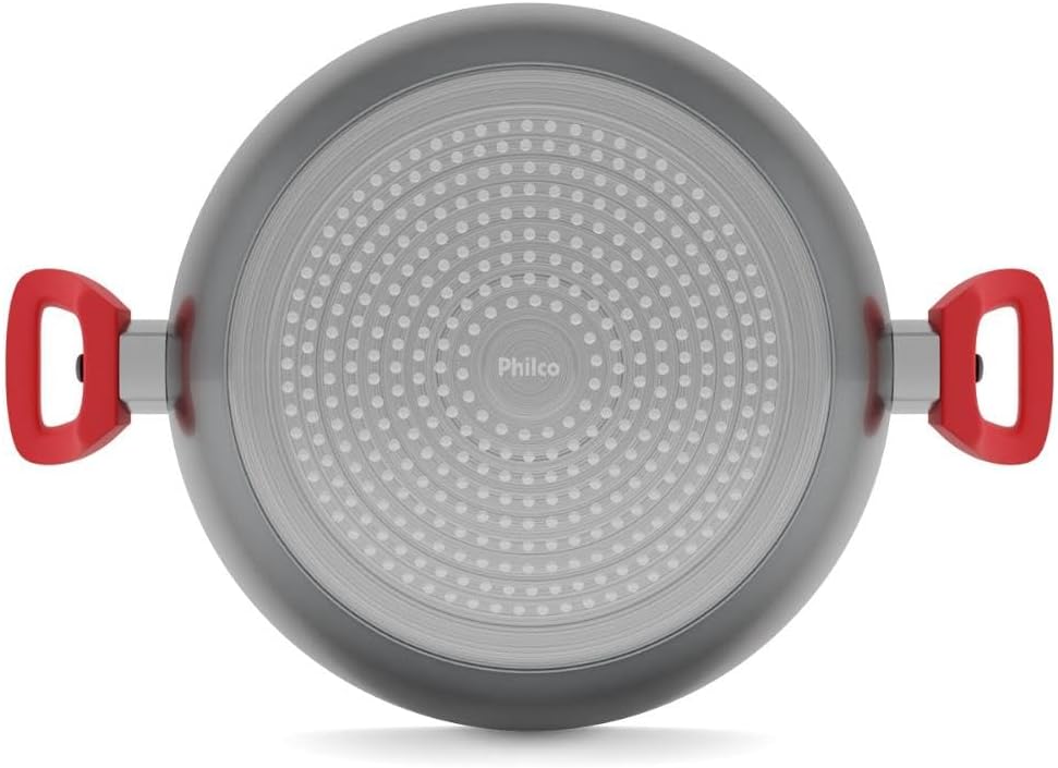 Alto poder antiaderente Redstone. Prepara alimentos sem grudar e é muito mais fácil de limpar. Pode ser utilizado em queimadores elétricos, a gás, radiante, indução e vitrocerâmicos. Com revestimento emborrachado, evita queimar as mãos. Possui alta resistência ao calor enquanto você cozinha. Panela com fundo de 4,5 mm para distribuir e manter a temperatura. Tampa com válvula de saída de vapor.