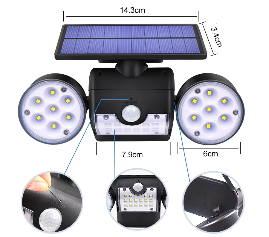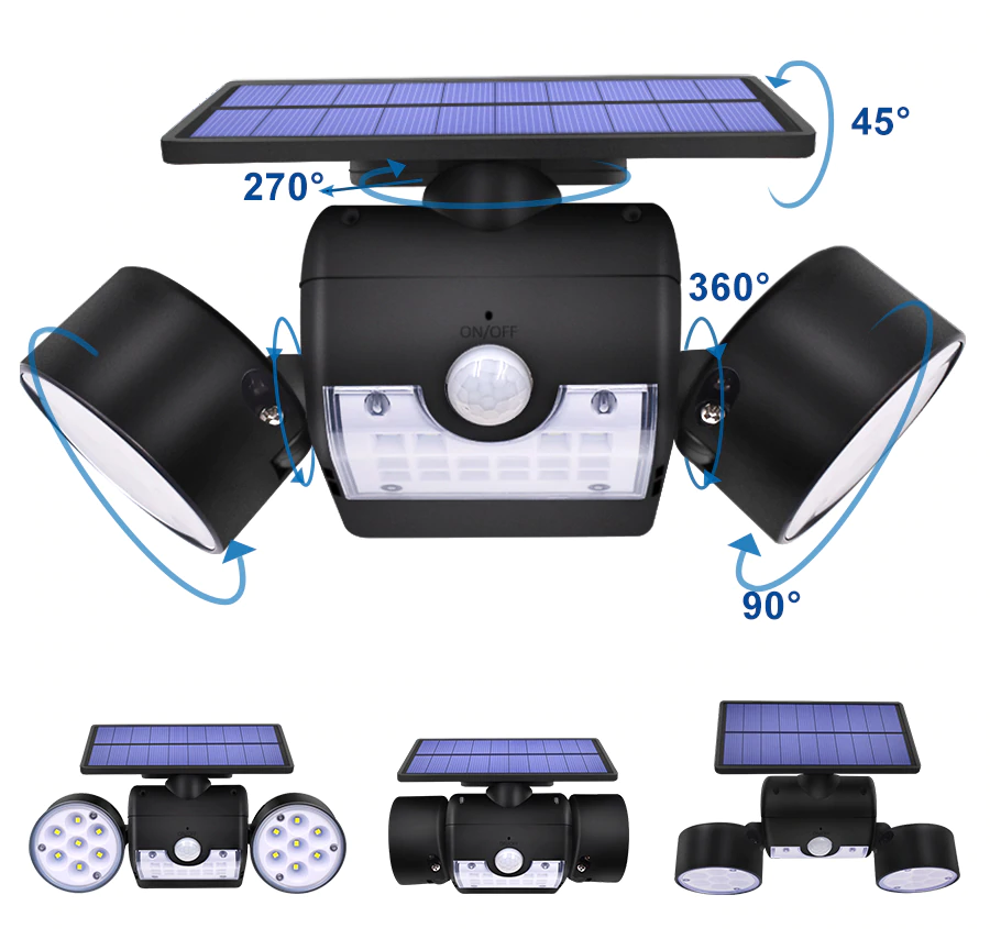 O Solarizze™ conta com um design único de grande angulação, oferecendo uma área de cobertura muito grande. Existem 14 luzes LED nas laterais e 16 luzes LED no meio. Painéis solares de 360° e focos giratórios de 360°. Você pode girá-los de forma independente e flexível para definir o ângulo desejado.